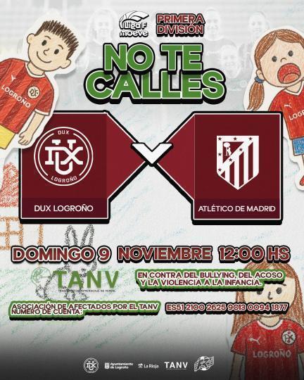 "Nos pusimos en contacto con la Asociación TANV, (Asociación de afectados por el Trastorno de Aprendizaje No Verbal) y les propusimos aprovechar el altavoz de un partido tan importante como el que va a disputar el DUX Logroño frente a un equipo de Champions como es el Atlético de Madrid, para sensibilizar a la sociedad y a nuestros jóvenes en la importancia de no callarse, de contar lo que les pase ante cualquier atisbo de intimidación, acoso, bullying o violencia tanto física como psicológica que pudiesen recibir”, indicó Martínez.