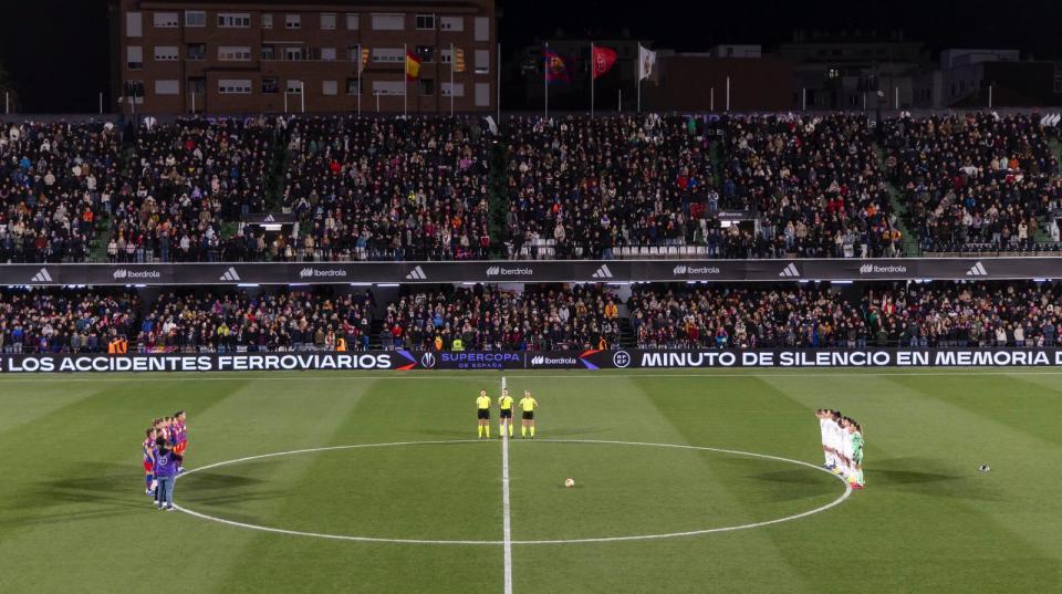 Tras eliminar al Athletic Club y al Atlético de Madrid respectivamente, el FC Barcelona y el Real Madrid CF saltaron al terreno de juego del estadio de Castalia ante 12.593 espectadores con la idea de conseguir llevarse la Supercopa de España. Antes del inicio del choque se guardó un emotivo minuto de silencio en memoria de las víctimas de los accidentes ferroviarios. Linda Caicedo no tardó en animarse en busca del gol, pero el conjunto culé intentó tener pronto el dominio del balón. La más clara llegó a los veinte minutos de juego, con un zapatazo de Vicky López desde fuera del área que sacó Misa Rodríguez con una buena mano abajo. Precisamente, tras ese saque de esquina llegó el primer tanto del duelo. Un córner botado por Mapi León lo peinó Esmee Brugts desde el primer palo para abrir el marcador.