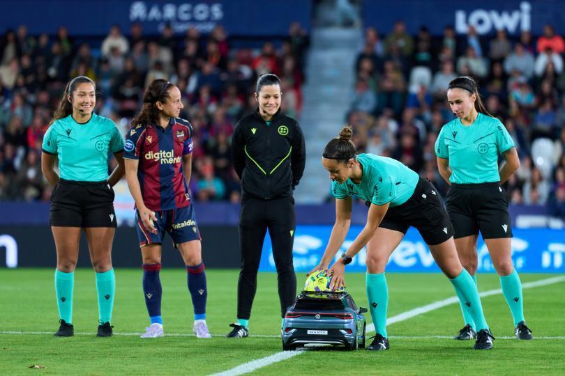 Antes del inicio del choque entre el Levante UD y el FC Barcelona en el Ciutat de València, un coche teledirigido de Volkswagen entró al terreno de juego con el balón oficial de Liga F, que la colegiada recogió para dar el pistoletazo de salida al partido. Una acción inédita en el fútbol femenino español.