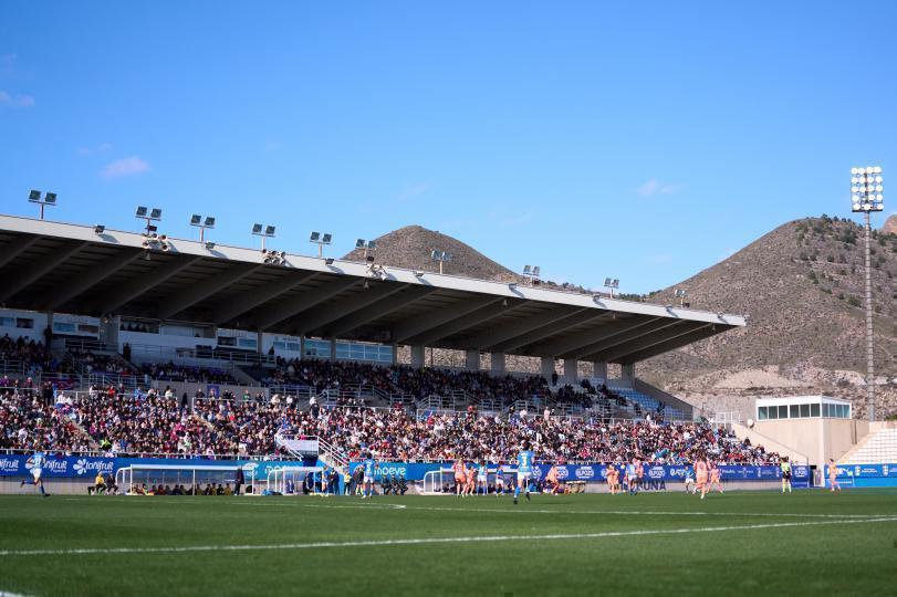 Con un estadio Francisco Artés Carrasco lleno hasta la bandera, ambos equipos saltaron al terreno de juego. Las visitantes no tardaron en hacerse con el control del esférico y se animaron a balón parado. La primera gran ocasión del encuentro fue para Claudia Pina, que se sacó un derechazo desde la frontal del área, pero el chut de la atacante se encontró con el vuelo sin motor de Sol Belotto, que despejó la acción con un paradón. La joven arquera no tardaría en volver a ser protagonista, esta vez, con una mano cambiada a un disparo de Kika Nazareth. La insistencia blaugrana logró su premio en el minuto 22. Un envío desde la esquina de la futbolista portuguesa lo controló en el segundo palo Claudia Pina. La de Moncada y Reixach no falló y fusiló la meta la local con un potente remate.